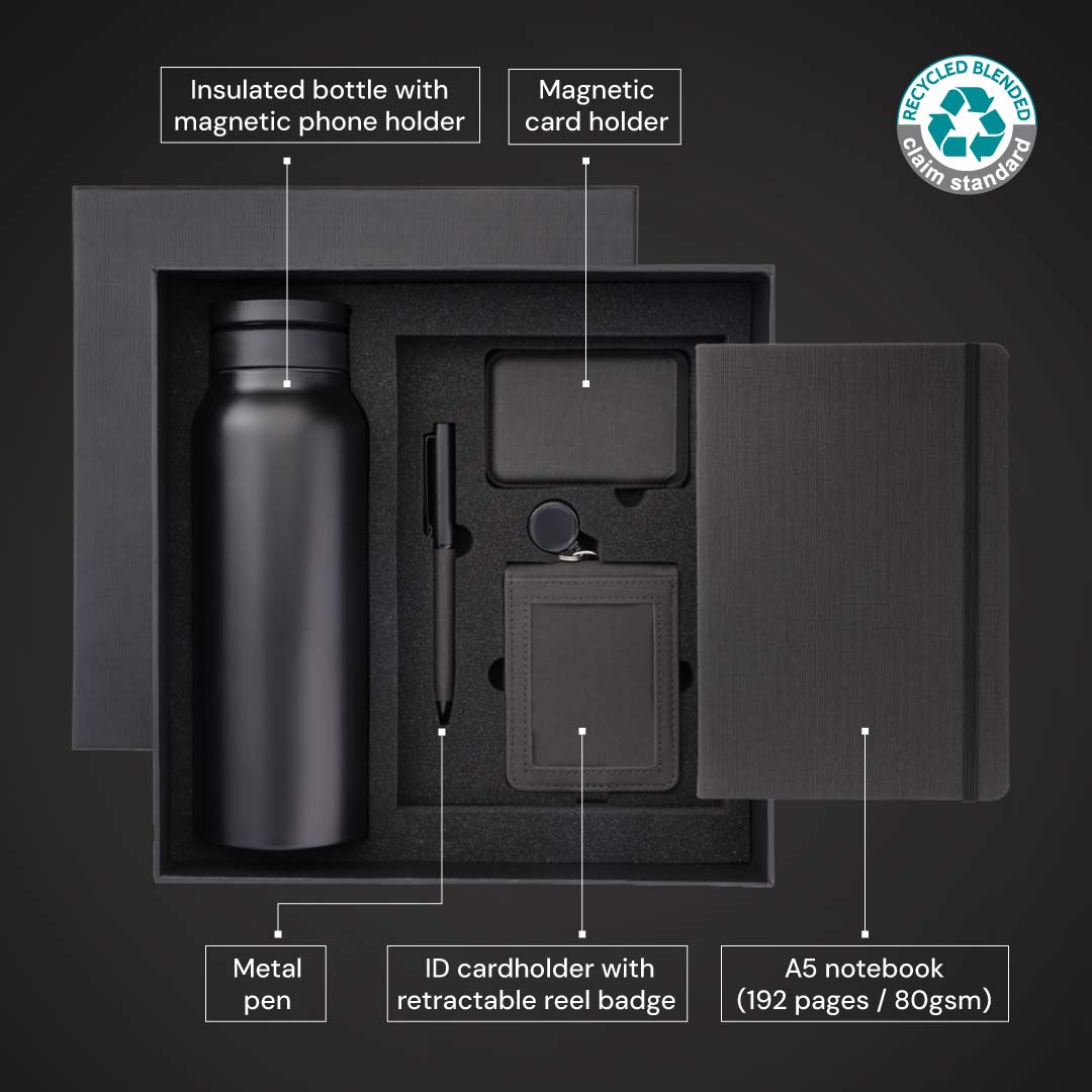 This CHANGE ZERO gift set of 5 items includes a color-matching A5 notebook (192 pages / 80gsm), insulated bottle with magnetic phone holder, metal pen, ID cardholder with retractable reel badge, and magnetic card holder - all products made using GRS-certified recycled PU material. By using recycled PU, this gift set has reduced it's carbon footprint by 1.2% vs. a traditional gift set. Furthermore, this gift set has enabled the offset of the remaining emissions (5.6kgCO2e) by funding renewable energy projects operated by ClimatePartner, making it effectively carbon-neutral. This is the perfect gift of choice for gifting your gratitude.