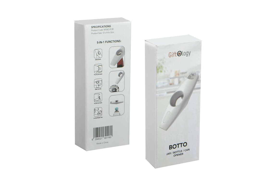 Botto is a handy kitchen or picnic accessory with 5-in-1 multi-functions that can help open different types of seals and caps in jars, bottles, cans, etc. Great promotional product, especially for marketing your food brand or delivery service. Packed in a gift box