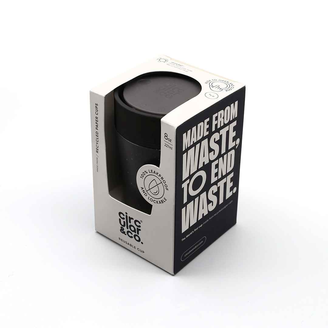 Circular Cups are the world’s first circular solution for reusable coffee cups. The Circular Cup is made from 6 recycled single-use paper cups, is designed for 10 years of use, and 100% recyclable at the end of life, contributing to a circular economy for coffee cups. Designed with practicality and circularity in mind, our sustainable travel mug is 100% leakproof with locking lid mechanism, providing peace of mind whilst you’re on the go. Circular Cups unique push lid mechanism minimises spills and offers one-hand opening. Enjoy the full coffee flavour with 360-degree drinking. Every purchase of a Circular&Co. Reusable Coffee Cup funds a sustainable solution to global waste. Packed in a gift box