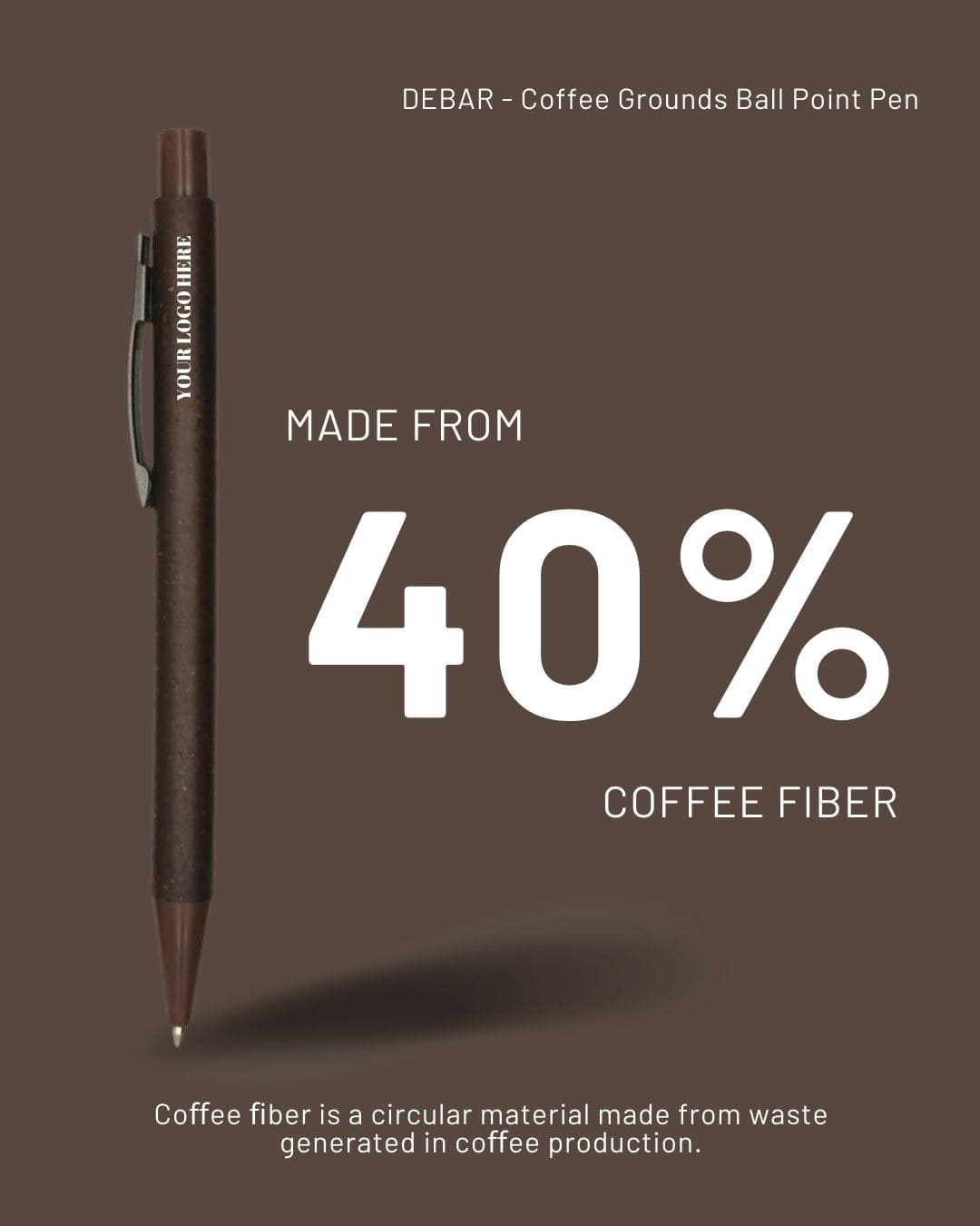A ballpoint pen with barrel made from 40% coffee fiber material. Coffee fiber is a circular material made from waste generated in coffee production. Blue ink.