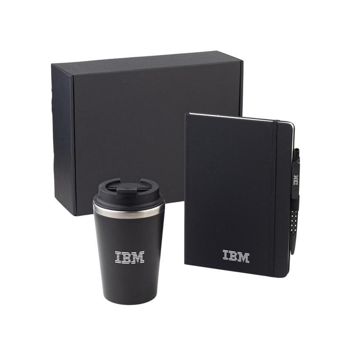 Gift set containing a double walled leakproof tumbler (350ml), A5 soft touch hardcover notebook and hexagonal barrel ballpoint pen - all 3 items are color matched in the gift set. Great value gift set from Giftology. Packed in a cardboard paper gift box.
