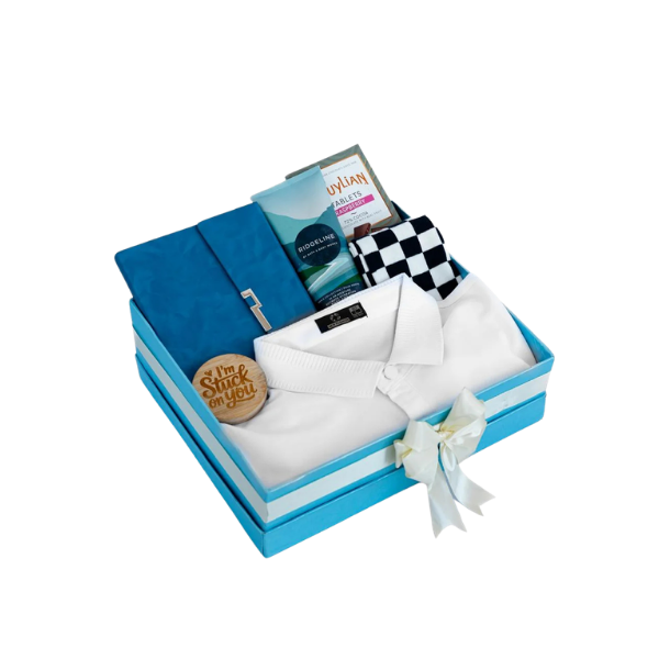 A stylish and thoughtful gift set featuring a high-quality notebook, a premium polo shirt, Bath & Body Works essentials, a pair of “Happy” socks, a chocolate bar, and a fridge magnet. Perfect for birthdays, celebrations, or special milestones, this hamper blends practicality, comfort, and indulgence, creating a memorable and well-rounded gifting experience for the modern man.