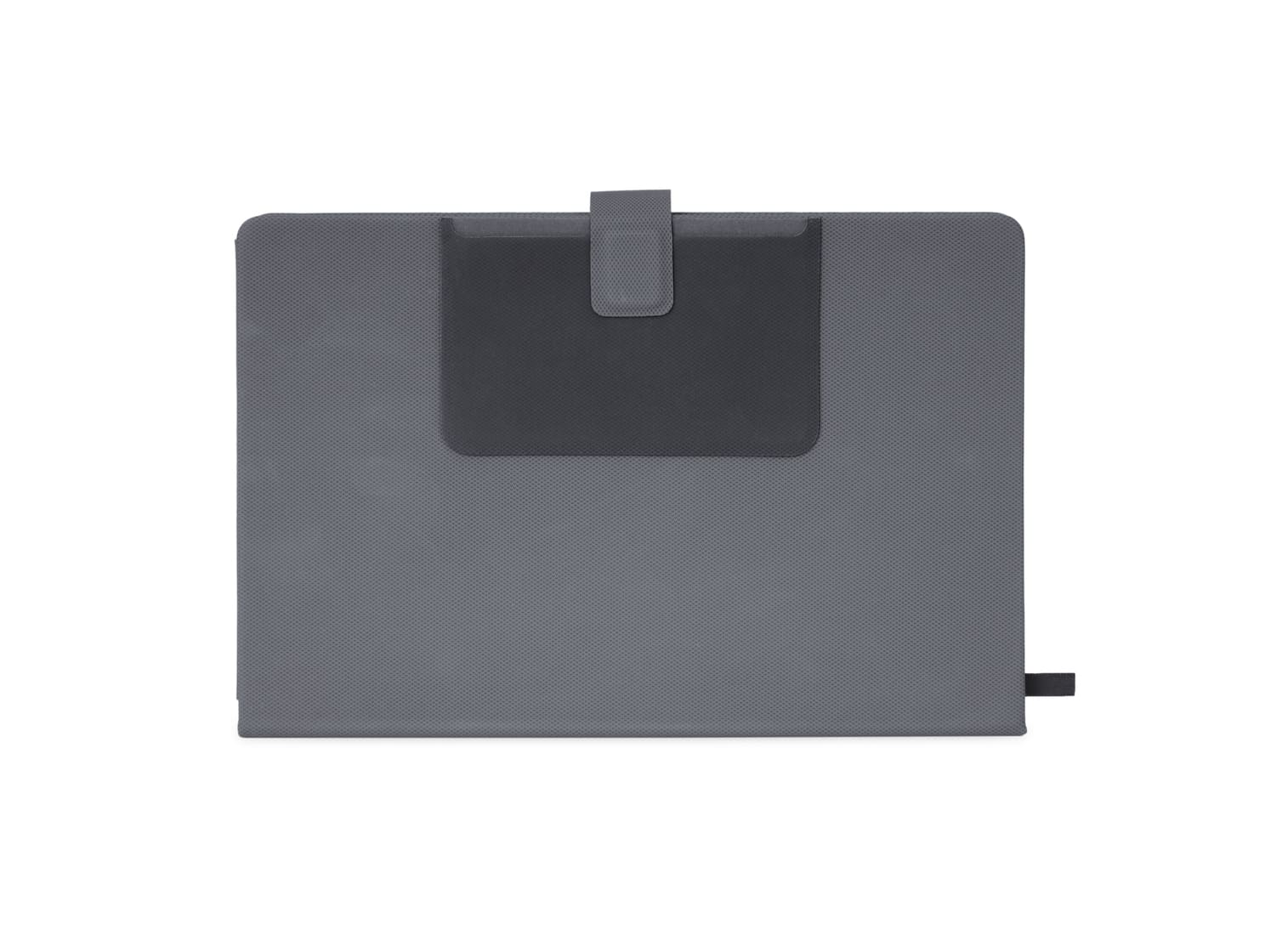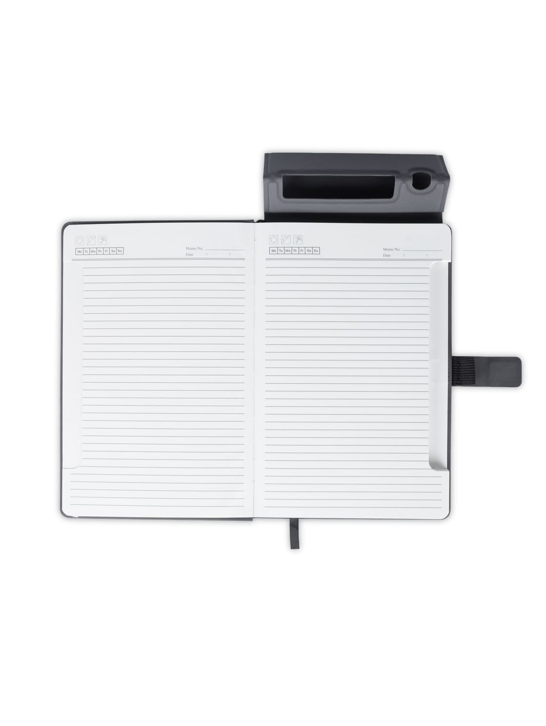 Manez is an A5 notebook organizer with in-built folding mini-workstation - truly an avant-garde modern office notebook. Includes an integrated business card holder, magnetic clasp with integrated pen loop. Contains 192 pages and a folding phone and pen stand. Opens flat due to excellent binding quality.