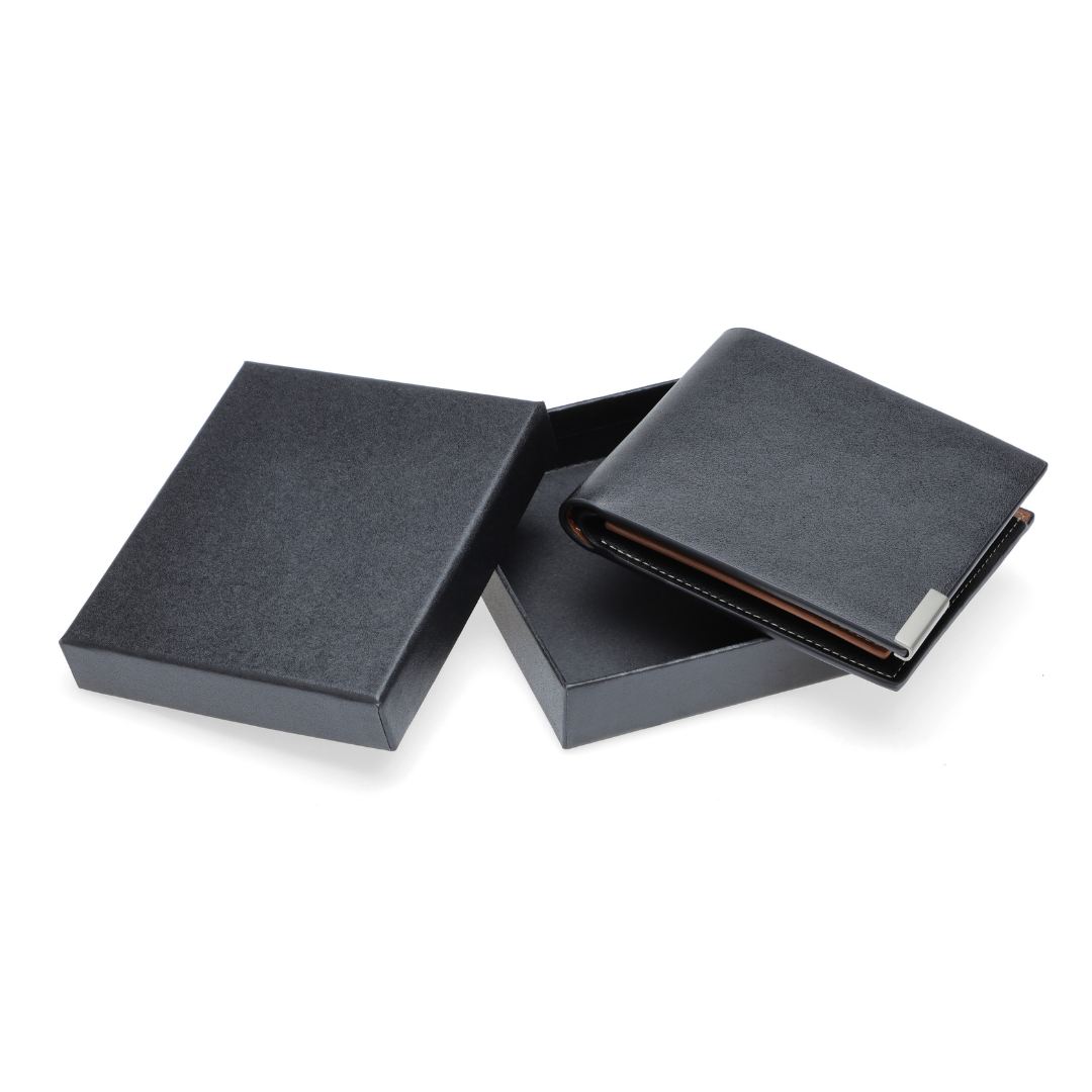 Men's Billfold PU wallet with flip pocket and packed in a gift box.