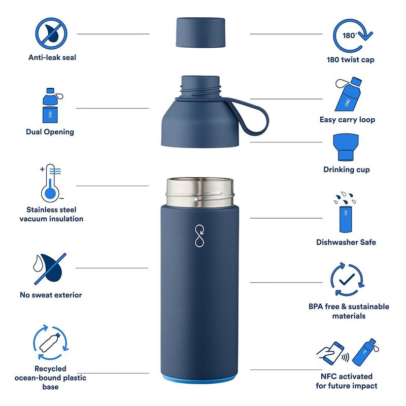 Small Bottle. BIG IMPACT. Each Ocean Bottle purchased funds the collection of 1000 plastic bottles entering the ocean. That's 11.368kgs of plastic. You can make an impact on ocean plastic today! How? The funds from the purchase of an Ocean Bottle go towards local communities living near plastic waste streams, who are paid Fairtrade International wages for the collection of ocean-bound plastic. This is all made possible with the help of Plastic Bank and powered by a traceable IBM blockchain verified plastic collection system. About the Ocean Bottle: 500ml, dishwasher safe, 10-year warranty, 100% recycled & recyclable packaging. Red Dot Design award-winning Ocean Bottle keeps cold drinks cold, and hot drinks hot. Made from double wall vacuum-insulated stainless steel and recycled content. The anti-leak dual opening lid makes filling and cleaning a breeze. Plus, unlike most reusable bottles, Ocean Bottle is 100% dishwasher safe.