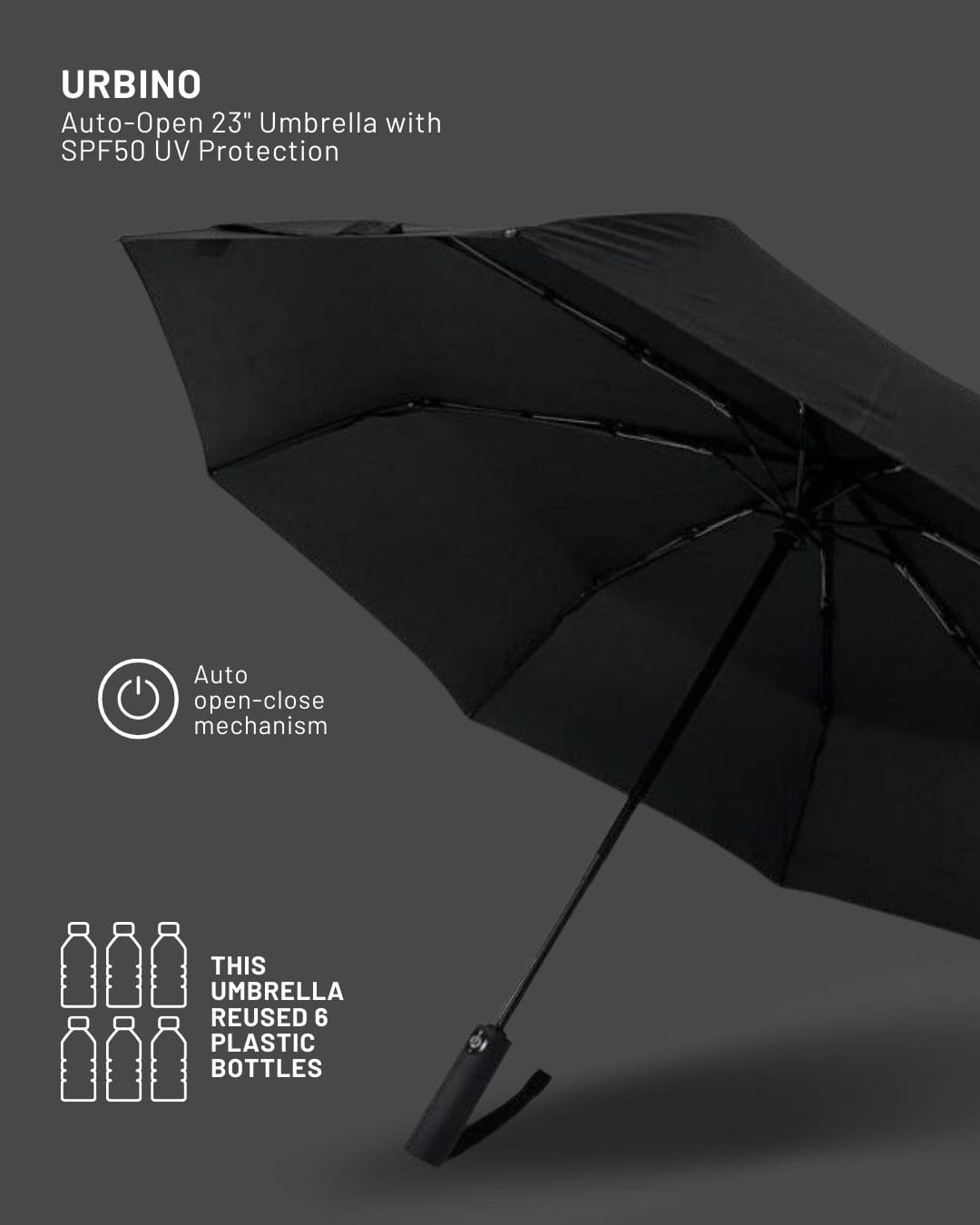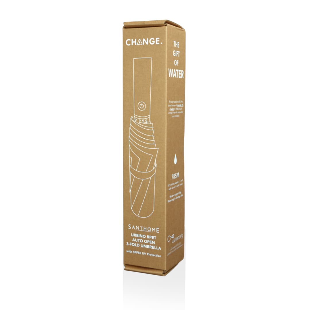 Urbino is a CHANGE Collection GRS certified 190T Recycled RPET auto-open & close 3-fold umbrella with SPF50 UV protection to lessen exposure from harmful UV rays. It features a fiberglass frame for extra strength and an auto open & close mechanism for easy use. Also comes with recycled PET fabric pouch. Packed in a recycled kraft paper gift box. Each umbrella reuses 6 PET bottles which would have ended up in a landfill or in the ocean. This umbrella contributes 3% of sales to Water.org - a global NGO that provides millions with access to safe water and sanitation. By giving to Water.org, you are giving a GIFT THAT GIVES BACK.